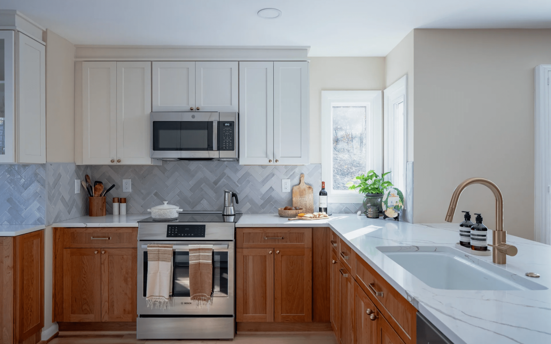 Sometimes the smallest details make the biggest impact. A herringbone tile backsplash creates this beautiful zigzag pattern that draws your eye to the cooking area and makes it feel special. What we really love about this pattern is how it connects different cabinet colors. Those diagonal lines seem to weave everything together perfectly. Whether you use classic subway tile or natural stone, herringbone always looks sophisticated without being too busy. It’s one of those kitchen remodeling ideas that adds just enough visual interest to keep things exciting.